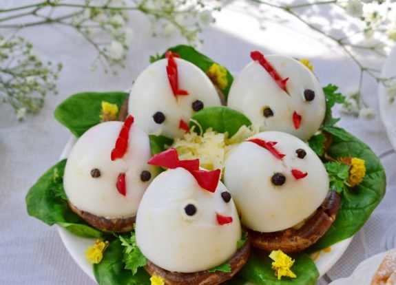 - We clean the eggs and cut 1 cm from the bottom. We make incisions in the eggs collect the heads of chickens. The eyes are made of pepper with peas, and the beaks and bell pepper scallops. Put spinach on a plate, mushrooms. Lubricate with mayonnaise, decorate with parsley and spread on top “chickens.”
