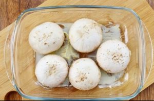 - Lubricate the form with butter, and champignon caps put the cut down. The oven must be preheated in advance, bake mushrooms for twenty minutes at 180 degrees.