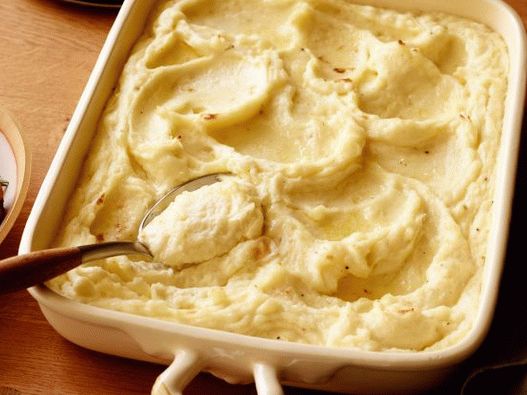 - Preheat the oven to 180 ° C. Peel and rinse the potatoes cold water. Cut each potato into 4 pieces. Put in large pan and fill with water. Bring to a boil and cook to softness (check by piercing with a fork) 20-25 min. Drain from potatoes water and put it back in the pan. Putting the pot on weak fire, mash potatoes with a nap: the more it comes out a couple is better. Knead the potatoes for about 5 minutes. Turn off the heat. Add butter, cream cheese, low-fat cream and spices. Stir and if the mixture turned out too thick, add milk. Check for enough spices adding salt and pepper to taste. Put mashed potatoes in a large casserole dish. On a surface put pieces of creamy oils. Cover with foil and bake in the oven for 15 minutes. Remove foil and continue cooking for another 10 minutes. Serve right away.