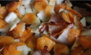 - Put chopped onions with carrots to the bacon, passer, add chopped smoked meats and fry all together for 4-6 minutes.