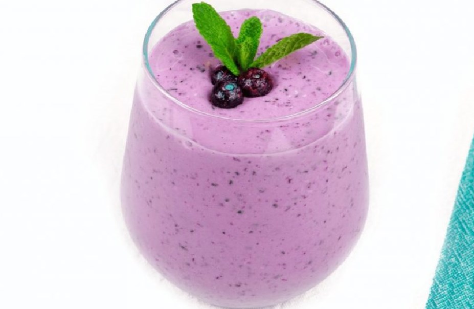- Smoothies are decorated with a leaf of mint and whole blueberries.
