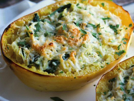 - Тыква-спагетти, фаршированная курицей, брокколи и сыром