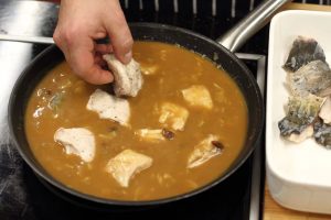 In the strained broth, cook the pickled pieces of carp on medium heat until cooked.