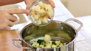 - Cut zucchini and pear into small pieces.