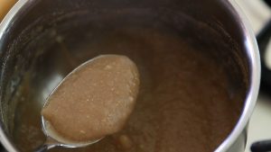 - Pour 1/2 cup of steam into the pan (it contains good nutrients) and add buckwheat flour. Cook on low heat for 5 minutes until creamy texture.