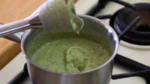 - Then add zucchini, pear and ricotta, pour oil and with grind using a submersible blender.