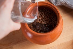- In the pot add buckwheat, pour boiling water, salt. Cover and send to the preheated oven (220 degrees).