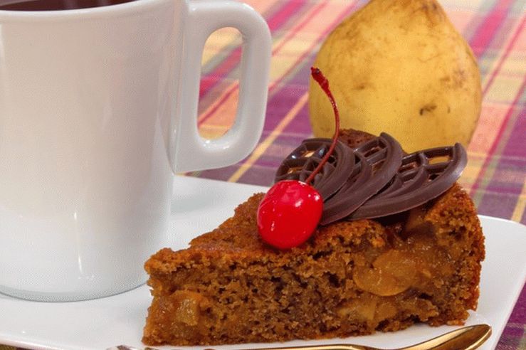 The recipe for a delicious pie, cook it at home with a pear. A fragrant pear in a delicate chocolate biscuit blends perfectly with a scoop of vanilla ice cream. You can decorate the pie ready chocolate shop leaves.