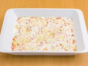 - In a rectangular ceramic baking dish (dimensions 20 × 30cm and height 5cm) lay out even a layer of pre-cooked rice.