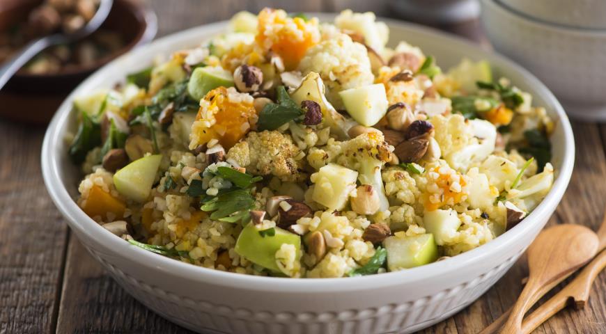 Very tasty and unusual homemade salad made with baked cauliflower and pumpkin. When you do, you can serve both warm and cold.