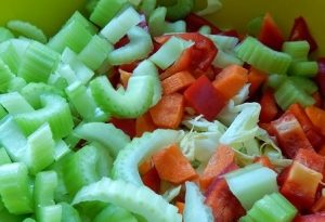 - Finely chopped white cabbage. Celery, Carrots and Peppers cut into small pieces.