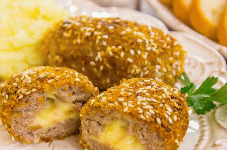 Fragrant, juicy, tasty meatballs with filling, cook at home, any hard cheese is suitable, can also be made with mozzarella, you can add to the breading mixture sesame seed, slightly dried on dry pan, and seasoning from dried herbs.