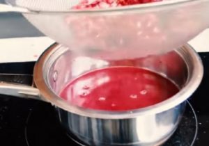 - Heat until sugar is completely dissolved, remove from heat and add cherry juice. You can use a sieve or juicer.