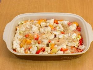 - In ceramic baking dish with sample size 20 × 30cm put prepared vegetables – onions half rings, bell pepper (peeled seeds, partitions) straws, tomatoes, cut into small pieces, Cauliflower taken apart by inflorescences.