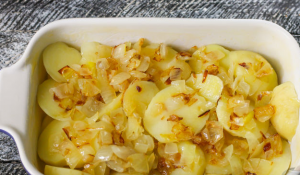 - Grease fireproof dishes. Put the circles on the bottom potatoes, put the onion on it.
