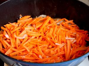 Chop and fry carrots and onions in 2 tablespoons vegetable oil until soft and a little blush.