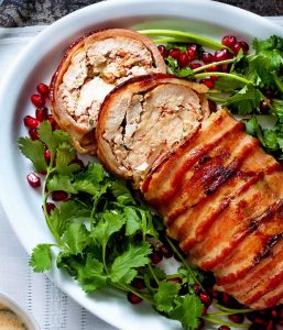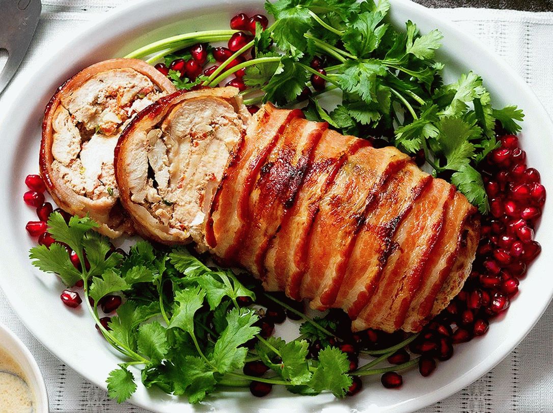 Tasty chicken roll in bacon, take out, shift to a dish with pomegranate seeds, sprigs of parsley and serve immediately.