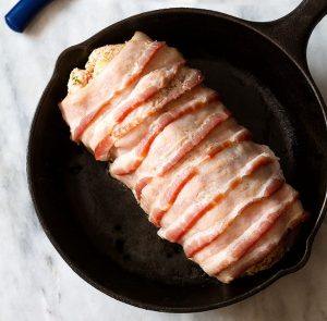 - The prepared cheese mixture is applied to chicken chops, turn into a roll and wrap in strips of bacon so that they closed each other. We put the oven at 170 degrees. If bacon bad holding, tie the roll with twine.
