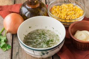 Finely grate the cheese in a bowl, add the prepared omelet, breast, pickled onions (squeeze a little) and corn.