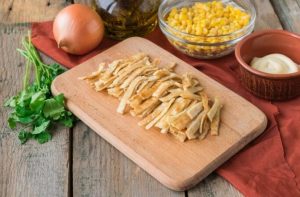 Boil chicken breast in salt water for 30 minutes, cool. Open the corn and drain.