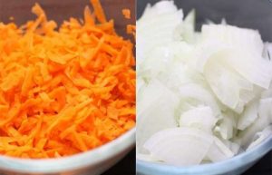 Fry onions with carrots in vegetable oil.