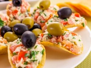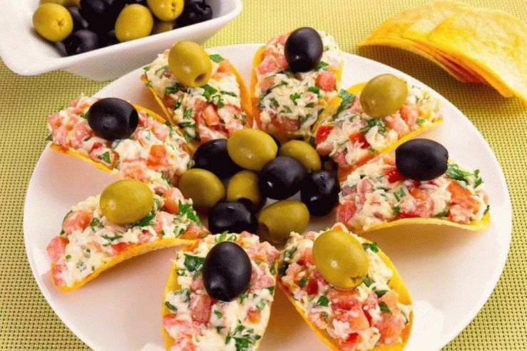 Delicious and original appetizer for holidays, receptions, family meeting. Since the chips quickly get hot, part of the snack can be cook at home just before serving, and part Serve in the form of a workpiece – put on the table prepared filling in a salad bowl, separately serve the chips themselves. Stuffing for this appetizer can be very diverse, except for too juicy. Chips can be potato or corn, most importantly, they must be wide and in the form of a boat. Choose olives and olives for decoration without pitted.