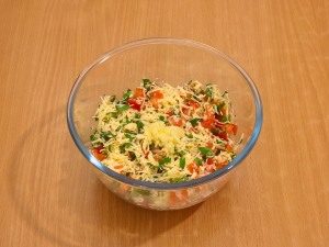- For the filling, cut the tomatoes into a small cube. Wash greens, dry, grind. Wipe hard quality cheese through fine grater.