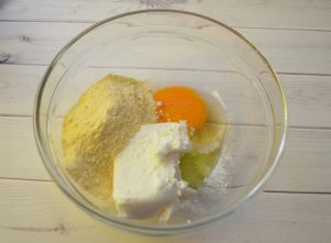 - Mix the egg, cottage cheese, baking powder, flour, salt and oil.
