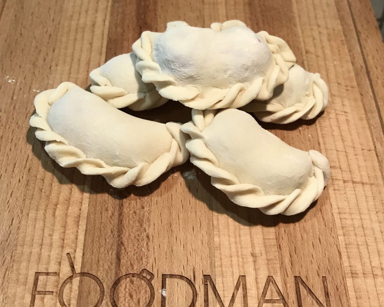 - Put the filling on the circle and fasten the edges together. Start to do beautiful border: fingers flatten the dough and wrap in border. Without moving your fingers flatten again and again wrap it up. And so on until the end.