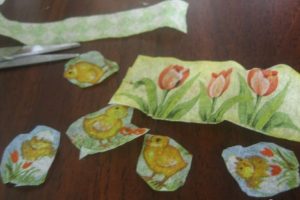 - We cut the decorative napkin into layers. From top layer cut out the picture we need.