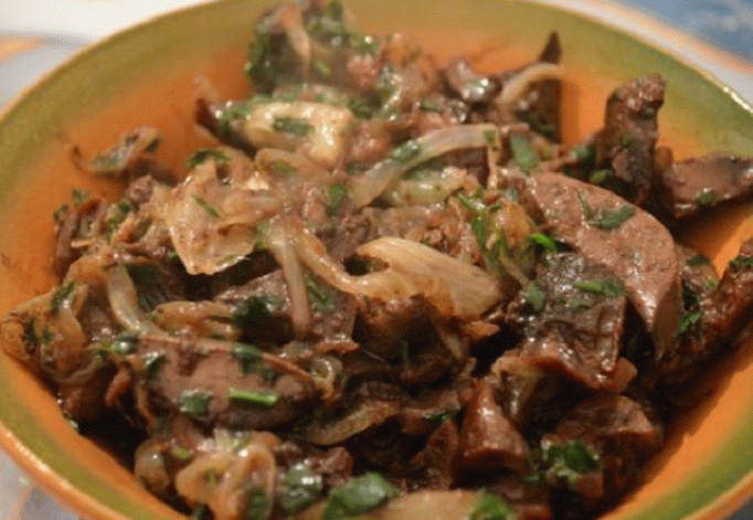 - Heat fat in a large pan, fry offal and pieces a rabbit.