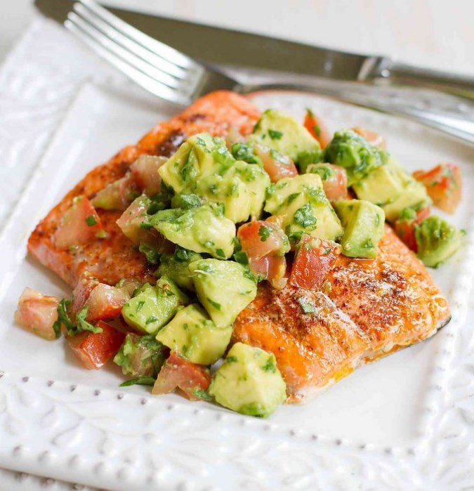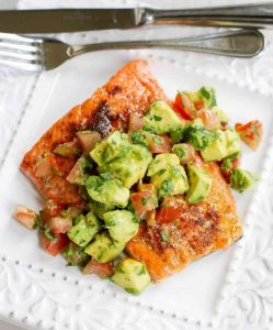 In hot oil, send prepared chum salmon and fry on medium heat for 3-4 minutes on each side. Fragrant Fried we send the chum salmon to plates, add the salsa from avocado on top and immediately serve.