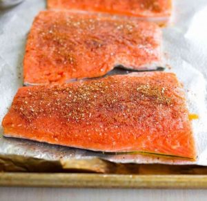 Wash chum fillet, dry, sprinkle with salt, paprika, chili pepper and ground caraway seeds.