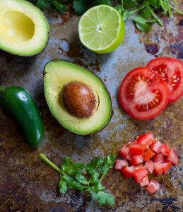 We remove the pulp from the avocado, cut into cubes with a tomato. Send to a bowl, add half lime juice, salt (2 pinches), chopped cilantro, finely chopped hot pepper and mix.