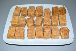 - Leave the tofu for a while so that the glass is full of liquid and it is dry. Then cut it into cubes.