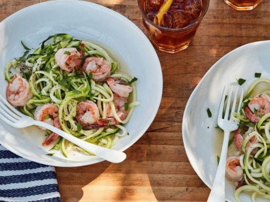 Zucchini noodles with shrimp and garlic sauce will be an excellent substitute for regular pasta for those who follow for his diet, or wants to cook light, but no less delicious dinner. Use noodle-shaped zucchini with a special vegetable slicer-spiralizer, or buy a ready-made vegetable noodles. Make a fragrant garlic sauce and boil in it shrimp and zucchini. This simple summer dish is so much for you. love to be a frequent guest at your desk. друзьями: