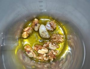 - Add nuts with garlic to the bowl, pour oil and vinegar, season with salt and pepper and grind.