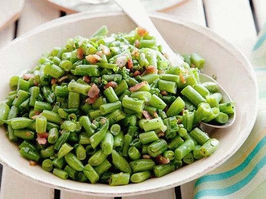 A side dish of green beans, cut into small pieces, it will be much more convenient to eat with a spoon, as an independent dish. Fried bacon will give it a lot of rich taste and pleasantly complement the texture of the dish is its crispness. And lemon peel and chives added at the end will make the beans taste brighter. For this dish choose a less fat bacon with large meat layers, then it will retain its lightness better. Nutritional value of one serving: (total 4) Calories 140, total fat 10 g, saturated fat g, proteins 5 g., Carbohydrates 8 g., Fiber g., Cholesterol mg., Sodium mg., сахар г.