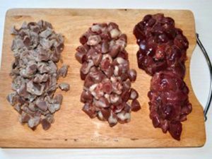 - Rinse, dry, chicken ventricles, hearts and liver, slice.