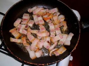 - Cut fat, melt in a pan. Fry onions on it with carrots.