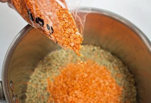 - Put both types of lentils in a pan, mix, pour water and set on fire. Bring to a boil, reduce the heat to minimum, cover and leave for 20-30 minutes. Red lentils will boil stronger than green, and green should be al dente.