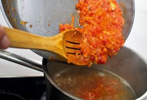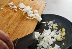 - While the lentils are boiling, heat the olive in a pan oil, add the cloves of garlic and simmer until fragrance. Add diced onion. Stew together until golden.