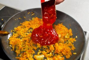 - Rub the carrots on a coarse grater and add to the pan, fry, and then add the tomatoes and peppers. Mix everything and simmer over medium heat, stirring, about 4-5 minutes.