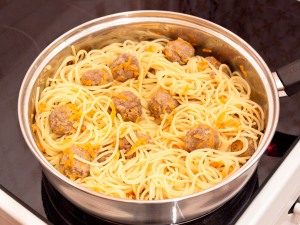 - Ready pasta, drain the water, add to the meatballs, lightly salt and pepper, stir well.