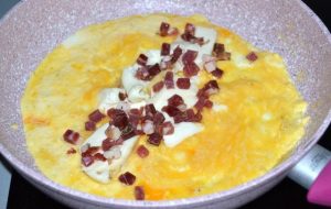 - As the omelet thickens a bit, put the bacon in the center with provolone.