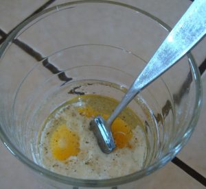 - Break the eggs into a bowl, add salt and pepper to taste, you can also dried herbs. Beat the egg mixture with a fork or whisk until homogeneity.