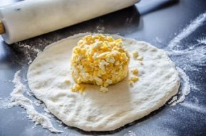 - We roll each half into a cake, put half fillings, pinch the edges to the center, put the pinch down and roll out into a cake.
