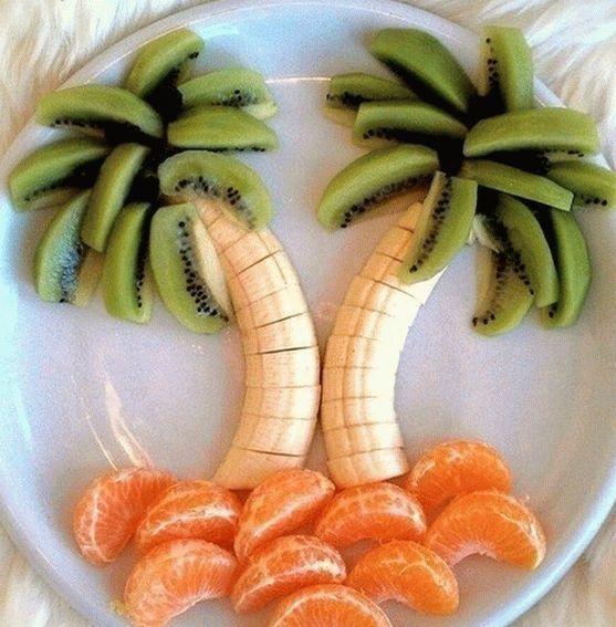 - Peel the banana and cut along. Put on a plate in the form trunks of palm trees.