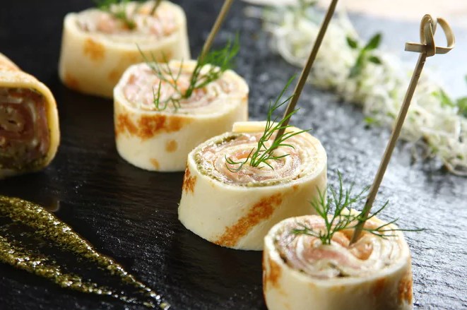 Stunningly delicious appetizer of pancakes, salted salmon, Pesto sauce and prepare mayonnaise at home for the festive table. Just do and easy to surprise.
