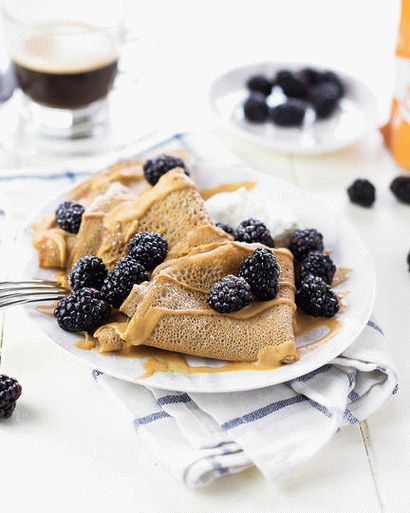 - Начинка с арахисовым маслом и джемом (PB&J). Наlay out each pancake 1 tbsp. l peanut butter and backside smear the spoons evenly, retreating from the edges by 1.3 cm. per layer oil 1-2 tsp. jam. In the center of each pancake lay out 5-6 blackberries.
